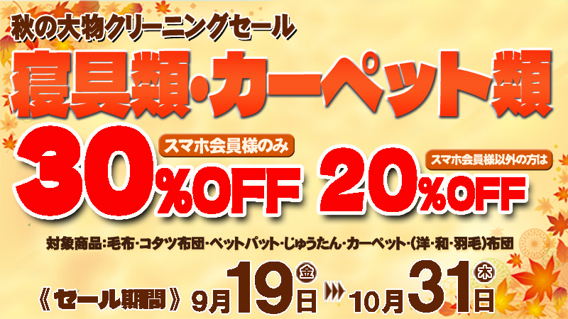 寝具類・カーペット類をセール価格にて受付中です。 スマホ会員様は30%OFF・スマホ会員様以外は 20%OFFとなります。
